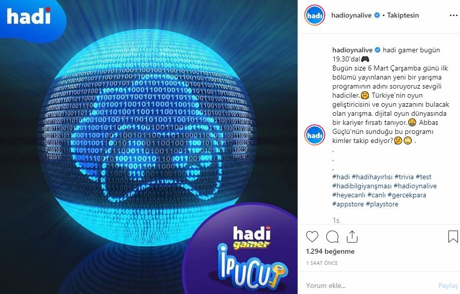 Hadi gamer bugün 19.30’da takipçileriyle buluşuyor. Instagram’dan yayınlanan ipucu sorusu şöyle: “Bugün size 6 Mart Çarşamba günü birinci kısmı yayınlanan yeni bir yarış programının ismini soruyoruz sevgili hadiciler. Türkiye’nin oyun geliştiricisini ve oyun yazanını bulacak olan yarış, dijital oyun dünyasında bir meslek fırsatı tanıyor. Abbas Güçlü’nün sunduğu bu programı kimler takip ediyor?”