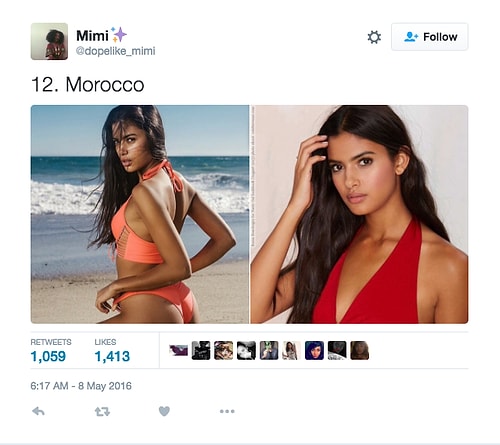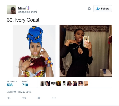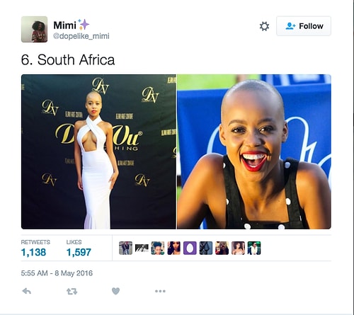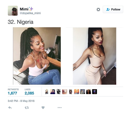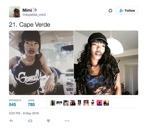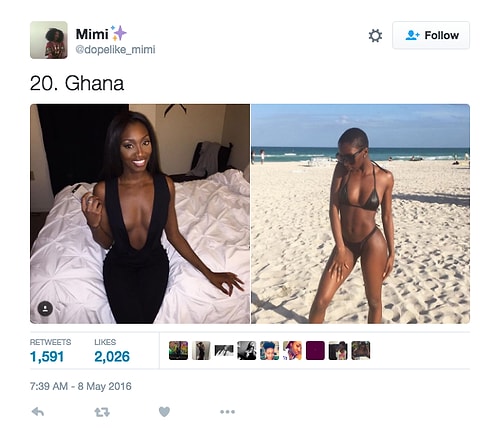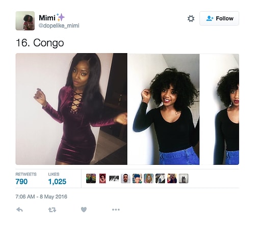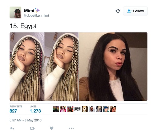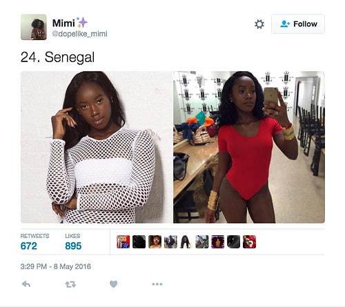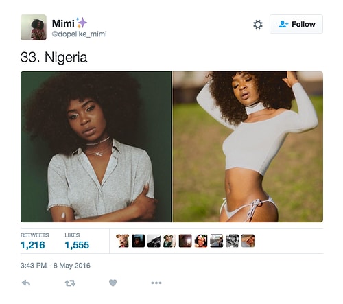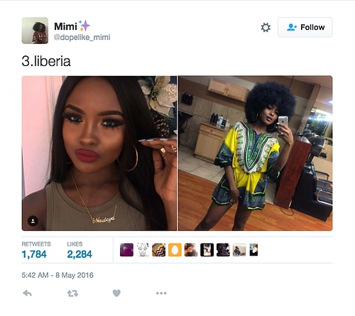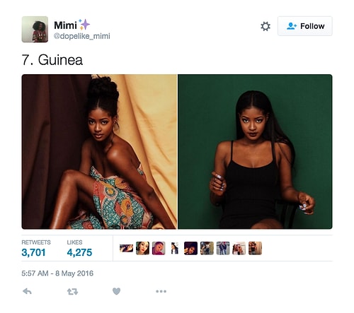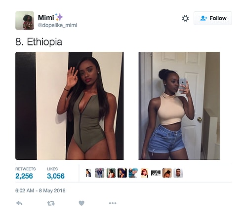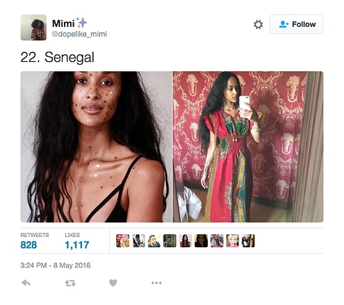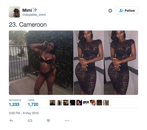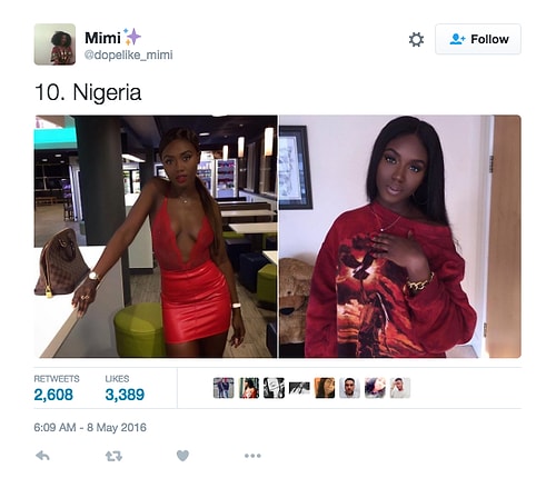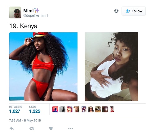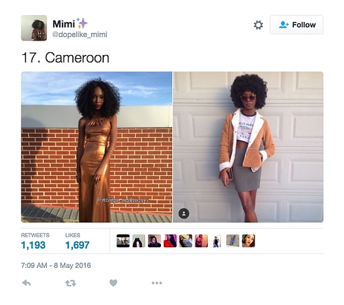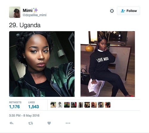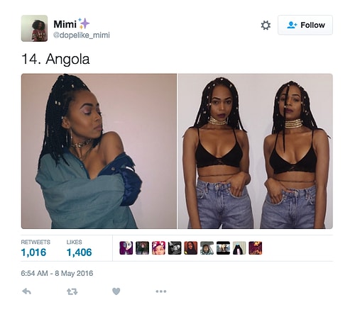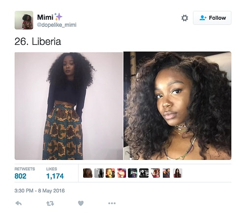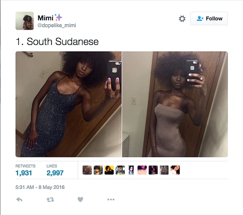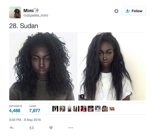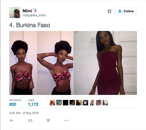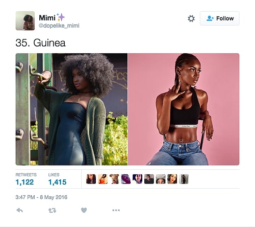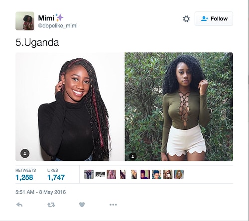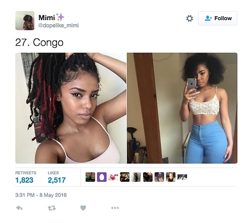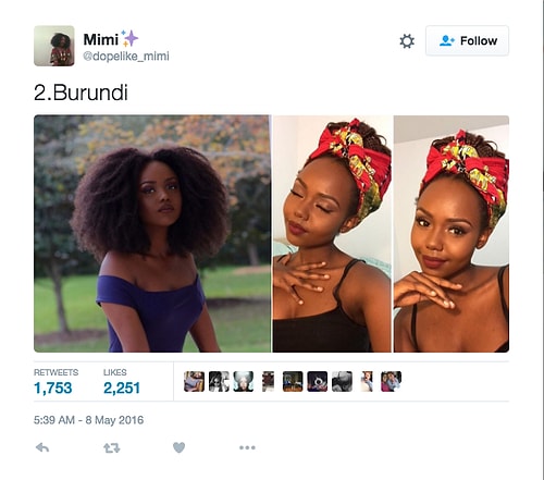 Twitter'da dopelike_mimi isimli kullanıcı o denli bir tweet flood'u yaptı ki internette üzerinde anında viral oldu. Afrikalı kızların yakışıksız olduğunu sav eden erkeklerin ırkçı akınlarından bıkan 18 yaşındaki Kamerunlu genç kız onlara adeta tokat üzere bir yanıt verdi. O denli ki tweet attığı birden fazla fotoğraf 1000 rt ve 1000 beğeni barajını aşarak tüm dünyadan birçok twitter kullanıcısına ulaştı.