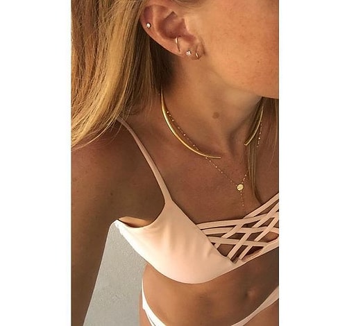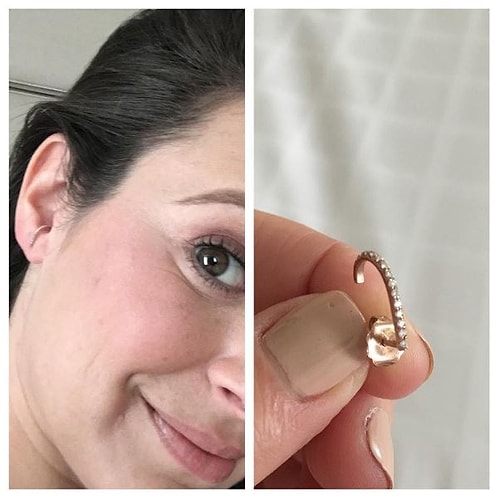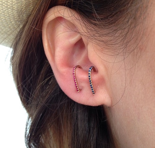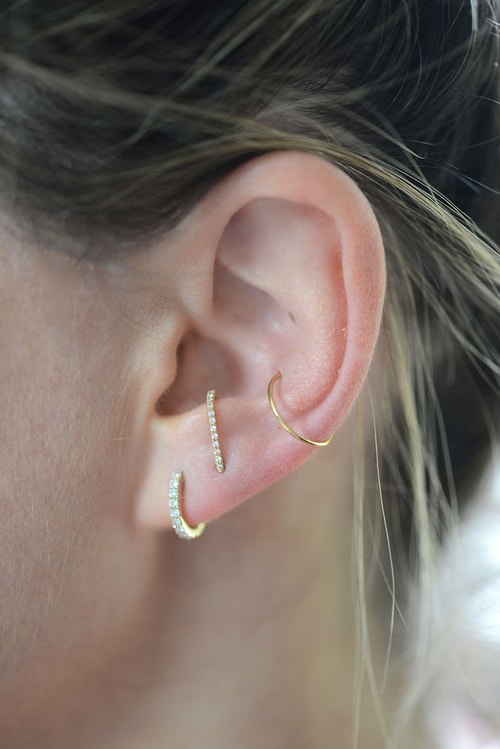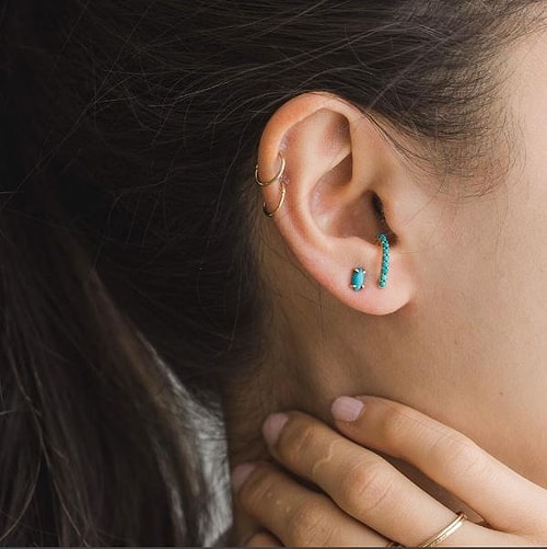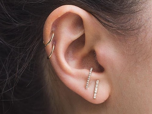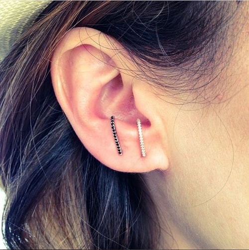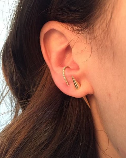 Bu küpelerin mantığı kolay, kulak göğsünün üstündeki boşluğa gizlenmek ve bir çeşit piercing imajı oluşturmak.