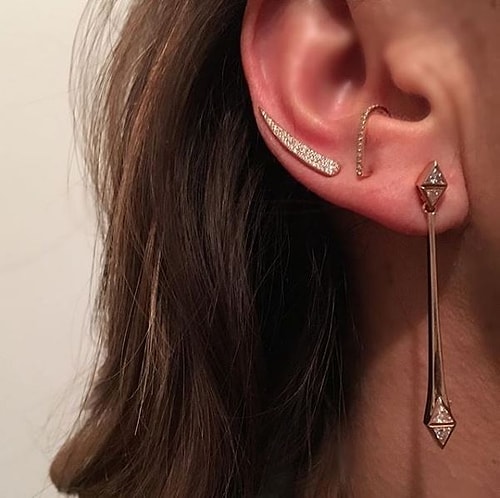 Ear cuff ve ear jacket'ların modası geçti. Artık moda ear suspender; yani kulak askıları ya da askı küpeler.