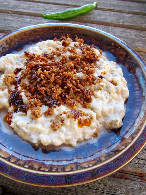 Patlıcanları bir tabağa yerleştirin. Üzerine yoğurdu dökün. Bir gece dinlendirdiğiniz etleri şayet mümkünse şişe takarak mangalda pişirin. Mümkün değilse ocakta tereyağında kavurun. Bu eti de hazır olduktan sonra yoğurdun üzerine koyun. Servise hazır.
