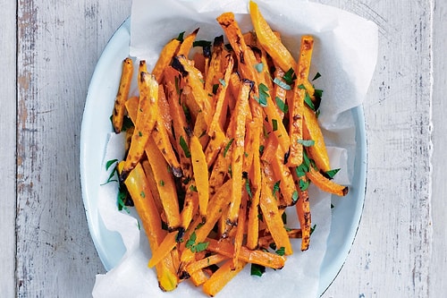 Fırını 200 dereceye ayarlayın. Kabakları soyup parmak formunda doğrayın. Bir kasenin içinde zeytinyağı ve baharatlarla birlikte karıştırın. 35 dakika pişirin.