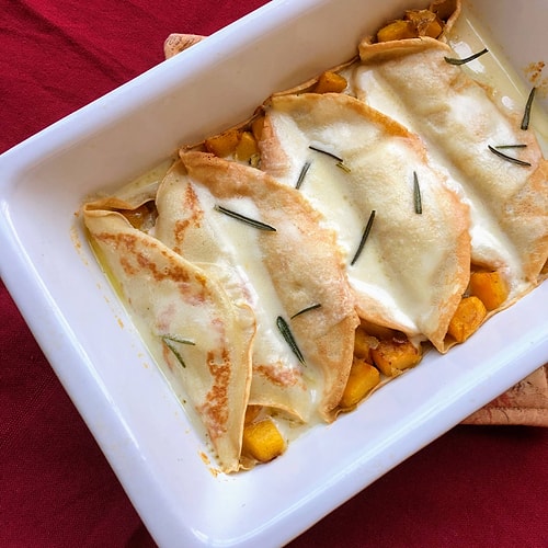 El mikseri ile yumurtayı çırpın. Yavaşça un, süt ve tuzu ekleyip güzelce karıştırın. Eritilmiş tereyağı ekleyin ve pürüzsüz olana kadar karıştırın. Hamurun üzerini örtün ve 1 saat buzdolabında saklayın. Küçük bir yapışmaz tavayı orta-yüksek ateşte ısıtın ve yağ sürün. Isınan tavaya krep hamurunu dökün. Krepleri pişirin. Orta tavada orta ateşte tereyağı ve zeytinyağı ısıtın. Bal kabaklarını ve pırasa ekleyin; tuz ve karabiberle tatlandırın. Bal kabağı yumuşayana kadar sık sık karıştırarak 7-8 dakika pişirin. Ateşten alın ve soğumaya bırakın. Fırını evvelce 200 dereceye ayarlayın. Bir güveç kabını yağlayın. Pırasa ve balkabağı dolgusunu kreplerin ortasından aşağıya hakikat ikiye bölün ve dolgunun kenarlarını katlayın. Doldurulmuş krepleri hazırlanan güveç kabına koyun. Üzerine kaşar peynirini dökün ve birkaç biberiye yaprağı ekleyin. 15 dakika pişirin. Hemen servis yapın.