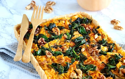 Fırını evvelce 200 ° C’ye ayarlayın. Tereyağı doğrayın ve materyaller birbirine yapışana ve sert bir hamur oluşturana kadar un ve suyla yoğurun. Hamuru en az yarım saat buzdolabında dinlendirin. Sonra merdane yardımıyla pişirme kalıbınızın formuna uygun bir biçimde açın ve içine yerleştirin. Çatal ile hamurun tabanında delikler açın. Doğranmış balkabağı yumuşayana kadar bol su ile pişirin. Püre haline getirin. Bir tavada zeytinyağını ısıtın ve soğanı kavurun. Altın rengi almaya başladıklarında şekeri ekleyip yaklaşık 5-10 dakika karamelize edin. Diğer bir tavada ıspanağı zeytinyağı ile soteleyin. Tuz ve karabiberle tatlandırın ve bir kenara koyun. Yumurtaları keçi peyniri ile karıştırın. Ceviz, kabak püresi, soğan ve ıspanağı ekleyin. Tuz, karabiber ekleyin. Karışımı kiş hamurunun üzerine dökün ve yaklaşık 40 dakika kadar pişirin.