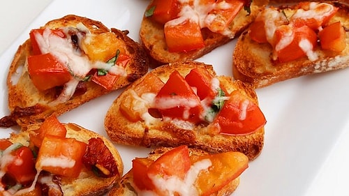 Fırını evvelden 180 derecede ısıtın. Büyük bir kapta, domatesleri, sarımsak, zeytinyağı, fesleğen, tuz ve karabiberi birleştirin. Karışımı 10 dakika bekletin. Ekmeği dilimleyin. Bir fırın tepsisine ekmekleri dizin. Üzerlerine hazırladığınız karışımdan paylaştırın. Son olarak üzerine rendelenmiş kaşar peyniri koyun. Peynir eriyene kadar pişirin.