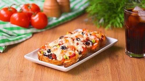 Sos tenceresinde sarımsak ve zeytinyağını soteleyin. Üzerine domates püresi, su ve tuzu ek edip pişirin. Ekmeği dilimleyin. Üzerine sostan sürün. Üzeri için hazırladığınız gereçleri dizin ve en üstte kaşar peyniri rendesi serpin. Önceden ısıtılmış 180 derece fırında 15-16 dakika pişirin.