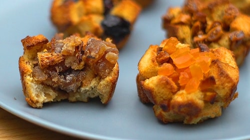 Ekmekleri küp kesin. Süt, yumurta, bal, şeker ve baharatları çırpın. Ekmekleri içine atıp karıştırın. Muffin kalıplarını yağlayın ve ekmekli karışımı paylaştırın. Üzerine istediğiniz materyalleri koyup içlerine hakikat biraz bastırın. 180 derece fırında 20-25dk pişirin.