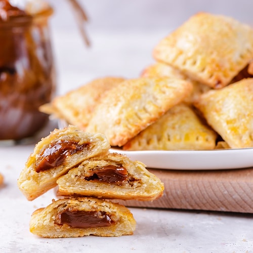 Pizza kesici yardımı ile milföy hamurlarını kareler halinde eşit kesimlere ayırın. Süt reçelini hamur modüllerinin içine sürüp kenarları sıkıca kapatın. Aralıklı olarak yağlı kağıt serili fırın tepsisine yerleştirdiğiniz reçelli milföyleri 180 derecelik evvelce ısıtılmış fırında 15-20 dk kadar pişirin. Hafif hamurların üzeri kızarıp reçeller erimeye başladığında fırından çıkarın. Üzerine pudra şekeri serperek, servis edebilirsiniz.