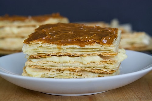 Fırını evvelden 180 dereceye ısıtın. Milföy hamurunu talimatlara nazaran pişirin. Milföy hamurlarını bir çatalla delin ve üstüne şeker serpin. 15 dakika yahut kızarana kadar pişirin. Büsbütün soğumalarını bekleyin. Sırasıyla aşağıdan üst; milföy, muhallebi ve süt reçeli katlarını birleştirin. Tatlımız hazır!