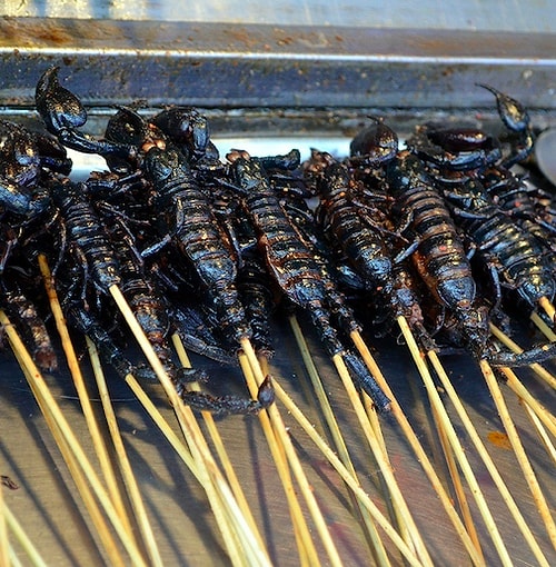 Çinliler kızartılmış kara akrebi de atıştırmalık niyetine yiyor.