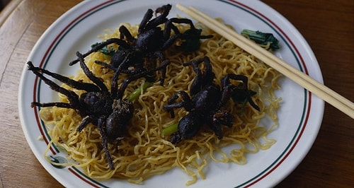Maalesef kızartılmış örümceği de yiyorlar… Tekrar atıştırmalık niyetine ya da bu halde yemeklerin üzerinde tüketiyorlar.