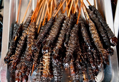Hepimizin zıplayarak kaçtığı kırkayak, Çinliler için lezzetli bir atıştırmalık. Gördüğünüz üzere kızartılmış kırkayakları atıştırmalık niyetine tüketiyorlar.