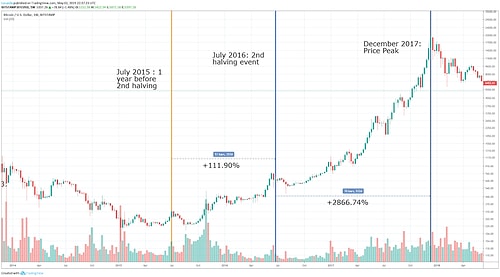 Her 4 yılda bir kere (210.000 blokta 1) BTC üretimi yarı yarıya azalmaktadır. Daha evvel 29 Kasım 2012’de (210.000. blokta) birinci sefer, 10 Temmuz 2016’da da (420.000. blokta) ikinci kere gerçekleşen halving olayları sonucunda blok mükafatları sırasıyla 50 BTC’den 25 BTC’ye, 25 BTC’den de 12.5 BTC’ye düşmüş oldu.