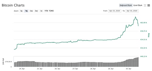 30 Nisan'da gün içinde 65 bin TL'ye kadar çıkan Bitcoin bu içeriği hazırladığımız an prestijiyle 61.346 TL'den süreç görüyor.