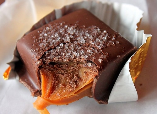 Karamel için 1 su bardağı toz şekeri yapışmaz yüzeyli tavada karamel rengini alıncaya kadar eritin. Üzerine 1 kutu krema ve limon suyunu ekleyip süratli bir formda karıştırın. Tüm materyaller karıştıktan sonra serin bir yerde bekletip sertleşmesini sağlayın. Çikolatayı benmari metodu eritin. Çikolata kalıbının tabanına deniz tuzu serpiştirin. Erittiğiniz çikolatayı çikolata kalıbına döküp çevirerek her yerine yayılmasını sağlayın fazlasını kaseye dökün. Kalıptaki çikolata donunca karamelli karışımdan ekleyin ve onun da donmasını bekletin. Son olarak kalan çikolatadan döküp 15 dakika bekletin.
