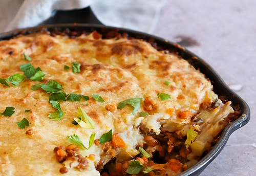 ilk olarak soğan ve havuçları küp küp doğrayın. Akabinde sırasıyla soğan ve havuçları soteleyin. Kıymayı da ekleyip kavurmaya devam edin. Kıyma suyunu bırakıp çektikten sonra baharatları ekleyin. Üzerine domates salçasını ekleyip karıştırın. Sonrasında unu da ekleyin. Et bulyonu yarım litre sıcak su içinde erittikten sonra harcın içine dökün. Son olarak bezelyeleri de ekleyip suyunu çekene kadar karıştırarak pişirmeye devam edin. Suyunu çektikten sonra pişen harcı bir fırın kabına alın.