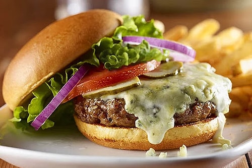 Kıymayı tuz ve karabiber ile yeterlice yoğurup ekmeklerin boyutunda köfteler hazırlayın. Izgarada pişirin. Soğanı tereyağında karamelize edin. Rokfor sosu hazırlamak için eritilmiş tereyağına süt ve kremayı ekleyin. Rendelenmiş rokfor peynirini de katıp sos yoğunlaşıncaya kadar 5-6 dakika pişirin. Hamburger ekmeklerinin içine sırasıyla rokfor sos, köfte, karamelize soğan ve en üste tekrar rokfor sos gezdirip servis yapın.