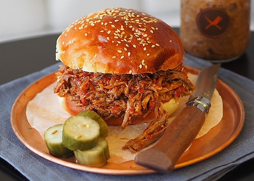 Döküm tencereyi orta yüksek ateşte uygunca ısıtın. Kaburgaların üzerine zeytinyağını göz kararı tuz ve karabiberi ekleyin ve elinizle ovun. Isınan tencereye kaburgaları aralıklarla ekleyin ve her tarafı uygunca kızarıncaya dek çevirerek pişirin ve akabinde bir tabağa çıkartın. Birebir tencereye soğan, sarımsak, kekik ve biberiye ekleyin ve soğanlar yumuşayana kadar bir dakika daha pişirmeye devam edin. Üzerine domatesleri ekleyin ve 1 dakika pişirin. Dana kemik suyunu da ekleyin ve mühürlenmiş olan etleri tencerenin içerisine geri koyun. Yemeğin suyunu kaynatın ve göz kararı tuz, karabiberi ekleyin. Ocakta kapağı kapalı olarak 3 saat kadar kemikten ayrılıp, lime lime olana dek pişirin. Döküm tencere kullanmıyorsanız hepsini fırın kabına alıp üzerini kapatıp 3 saat kadar 165 derecelik fırında pişirmeye devam edebilirsiniz. Pişme esnasında her saat başı yemeğin suyunu denetim edin. Şayet fazla azalmışsa içerisine bir çay bardağı kadar kaynar su ekleyin. Pişen ve suyunu çeken kaburgaları tencereden çıkartın. Eti çatal yardımı tiftik olacak biçimde parçalayın. Hamburger ekmeklerinin iç kısımlarını sosa yatırın ve 1 dakika bekletin. Hazırlamış olduğunuz hamburger ekmeğinin içine çokça dana eti ve sos koyun. Yanında turşu ile sıcak olarak servis edin.