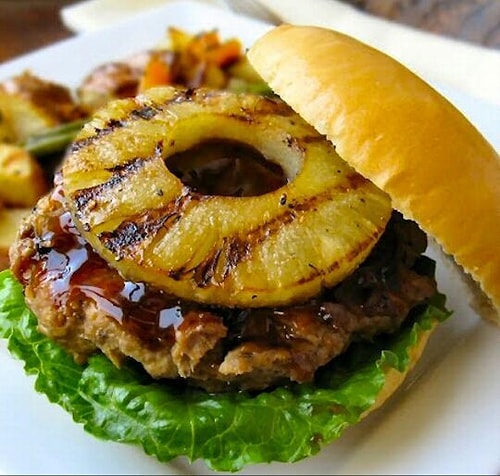 Yoğrulma süreci için kolaylık sağlayacak bir kaba tavuk kıymasını koyuyoruz. Ufak ufak doğradığımız kırmızı soğanların yarısını, doğradığımız kişnişin yarısını, yoğrulacak kadar yumuşak kıvamdaki tereyağını, barbekü sosunu, tuzu ve karabiberi de ekleyip yoğuruyoruz. Yoğurma süreci bittikten sonra karışıma burger biçimini veriyoruz. Evvelden ısıtılmış ızgarada tavuk burgerleri ve ananas dilimlerini pişiriyoruz. Burger ekmeklerini de ızgarada biraz ısıtıyoruz. Akabinde burgerlerin üzerine kalan doğranmış kırmızı soğanın yarısını, kişnişi ve ananas dilimini ekliyoruz. Dilersek başka bir sos da ek ettikten sonra burgerimiz servise hazır.