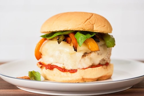 Hindi kıyması, galeta unu, 2 yumurta, rendelenmiş soğan, tuz ve karabiberi geniş bir kapta yoğurarak köfte harcını hazırlayın ve köfteleri yassı biçimde hazırlayın. Burger köftelerini ortalama 6 dakika boyunca pembeleşinceye kadar ızgarada pişirin. Peynir ekleyin ve 1 dakika kadar erimeye bırakın. Bu ortada, biberleri közleninceye kadar pişirin, tuz ekleyin, soğuyunca dilimleyin. Hamburgerleri alta sos üzerine köfte akabinde biber ve fesleğen olacak biçimde dizin.