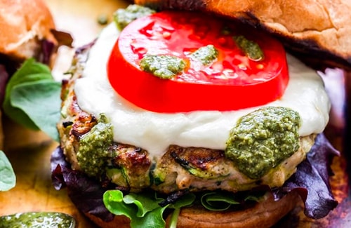 Bir kâsede hindi eti, galeta unu, yumurta, rendelenmiş soğan, güneşte kurutulmuş domates, parmesan peyniri, rendelenmiş sarımsak, tuz ve karabiberi karıştırın. Geniş bir kapta yoğurarak köfte harcını hazırlayın ve ellerinizle köftelere form verin. Dört eşit büyüklükte köfte formunda hazırlayın. Burger köftesini, 3 – 4 dakika kadar pişirin. Pişirmenin son dakikasında, her hamburgere bir mozzarella dilimi ekleyin ve yavaşça eritin. Akabinde hamburger ekmeğinin üzerine köfteyi, pesto sosunu ve rokaları ekleyin akabinde kapatın.