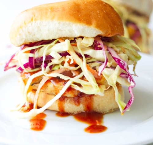 Tavuklara bıçağın ucu ile ince çentikler atın. Derin bir kasede ayran, kırmızı biber, tuz ve ezilmiş sarımsağı karıştırın. Tavukları karışıma ekleyin ve harmanlayın. Tavukları buzdolabında en az bir saat dinlendirin. Coleslaw salata için lahanaları ince uzun halde doğrayın ve kalın kesimleri ayıklayın. Havuçları rendeleyin. Zerzevatları derin bir kaba alın ve üstlerine yoğurt, mayonez, tuz ve limon suyu ekleyip ezmeden karıştırın. Salatayı dinlenmesi için buzdolabına kaldırın. Burger sosu için mayonez, hardal, ezilmiş sarımsak ve minik küpler halinde doğranmış kornişonu karıştırıp buzdolabına kaldırın. Tavuklar dinlendikten sonra buzdolabından çıkartın. Derin olmayan bir tavaya yağı koyup ısıtmaya başlayın. Bu esnada bir tepsiye dış kaplama için unu, baharatları ve ezilmiş krakerleri ekleyip harmanlayın. Yağ ısındıktan sonra altını kısın. Tavukları süzdürüp unlu karışıma daldırın ve her yeri kaplanana kadar yavaşça bastırın. Fazla unu silkeleyip orta sıcaklıktaki yağda bir kaç defa ter düz edip altın sarısı ve sert bir dokuya ulaşana kadar pişirin. Pişen tavukları peçete üzerine çıkartın ve dilerseniz yavaşça tuzlayın. Ekmekleri ikiye bölün her iki yüzeyine de mayonez sürüp tavada kızartın. Servis ederken ekmeğin alt kısmına sosu sürün, üzerine tavuğu yerleştirin sonara salatayı ekleyin ve ekmekle kapatın. Afiyet olsun.