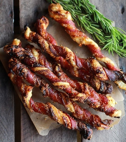 Sığ bir kapta kıyılmış cheddar peynirini, biberiye, pul biber ve bir tutam tuz ve biberi karıştırın. 2 adet milföyü birbirine yapıştırın uzunlamasına ve 3 parmak kalınlığında şeritler kesin. Bu şeritlerin içerisine cheddarlı karışımdan koyup köşelerden kapatın ve uygunca birbirine yapıştırın. Düzgünce kapandığına emin olduğunuz hamuru bir ucundan tutup öteki ucunu çevirerek bükün. Bir modül pastırma alın ve bükülmüş hamurun etrafına sarın. Kalan bükülmelerle tekrarlayın. Yumurtayı çırpın ve milföy hamuru görünen her yere sürün. Yağladığınız ızgaraya yerleştirip fırınlayın. Yaklaşık 20 dakika kadar pişirin.