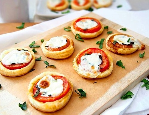Fırını 200 dereceye getirin. Milföyleri yavaşça açın ve yuvarlaklar kesin. Yuvarlakların ortasına çatalla delikler yapın. Daha sonra halka halinde dilimlediğiniz domatesleri yerleştirip üzerine birkaç damla balzamik sirke koyun. Daha sonra fesleğen ve en üstüne mozzarella dilimleri yerleştirip 12-15 dk pişirin.