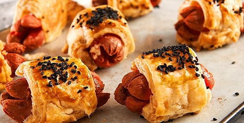 Milföyler çözüldükten sonra sosisi ortadan ikiye kesip milföylerin ortasına koyup sarın. Kat yerinin alta gelmesine itina göstererek tepsinize dizip milföylere bıçak yardımıyla verevine çentik atın. Yumurta sarısı sürüp ve çörek otu serpip evvelce ısıtılmış 180 derecelik fırında üzerleri kızarana kadar pişirin.