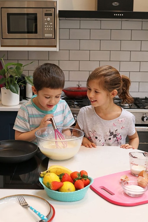 Kaseye materyalleri koyun ve çocuğunuz çırpsın. Elektrikli mikser yerine çırpıcı kullanın ki karıştırırken motor gelişimine de yararı olsun. Karışım hazırsa, sıra tavaya döküp çevirmeye geldi. Bunu yapabilmek için çocuğunuzun yaşının uygun olması lazım. Zira tavada pancakeleri çevirmek için biraz güç lazım. Lakin üzülmeyin, çocuğunuz küçükse de sizin tava ile yapacağınız gösteriyi izlemeye bayılacaktır.