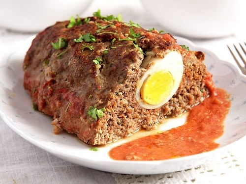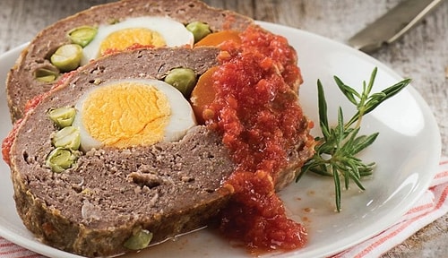 Kıymayı, rendelediğiniz soğanı ve öteki köfte gereçlerini bir kabın içerisinde düzgünce yoğurun. Pişirme kağıdının üzerine köfte harcını 1 parmak kalınlığında yayın. Ortasına haşlayıp soyduğunuz yumurtaları bütün formda sıra halinde dizin. Yanına haşlanmış havuç ve bezelyeleri dizin. Rulo halinde sarın ve pişirme kağıdı serdiğiniz tepsiye koyun. Evvelce ısıtılmış 180 derece fırında 45 dakika kadar pişirin. Sos için; rendelenmiş domates ve öbür materyalleri ekleyerek, suyunu çekene kadar pişirin. Köftenin üzerine dökerek servis edin.