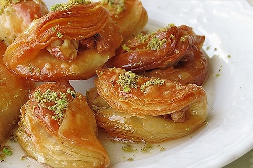 Hamuru için; bir kabın içerisine tüm gereçleri alın ve yoğurun. Yoğurduğunuz hamuru 24 kesime bölün ve yuvarlayın. Hazırladığınız bezeleri üzerini kapatarak yaklaşık 1 saat dinlendirin. Mühlet sonunda 12 bezeyi teker teker nişasta ile 10-12 cm çapında açın. Açtığınız hamurları ortalarına nişasta serperek üst üste koyun ve yaklaşık yarım santimetre kalındığında açın. Bir bardak yardımıyla yuvarlak biçimler kesin. İçerisine dövülmüş ceviz ekleyin ve ay formunda kapatın. Başka 12 bezeyi de tıpkı formda hazırladıktan sonra hamurları tepsiye dizin. Üzerine erittiğiniz tereyağından sürün. 180 derece fırında kızarana kadar pişirin. Şerbeti için; suyu ve şekeri tencereye alın. Şeker eriyene kadar karıştırın ve kaynatın. Kaynadıktan sonra limon suyu ekleyip 15-20 dakika kısık ateşte pişirin. Evvelce hazırlayıp ılıttığınız şerbeti tatlınızın üzerine dökün. Servis ederken dilerseniz antep fıstığı serpebilirsiniz.