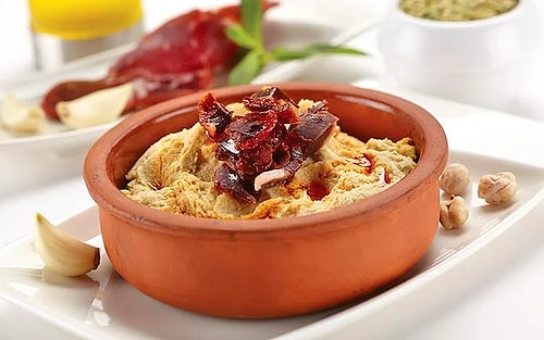 Pastırma hariç bütün materyalleri rondodan geçirin. Güveci çok az yağlayın ve humusu içerisine alıp yeterlice yayın. Üzerine pastırma dilimlerini dizin. Biraz zeytinyağı gezdirip 190 derece fırında 10 dakika pişirin. Sıcak servis edin.