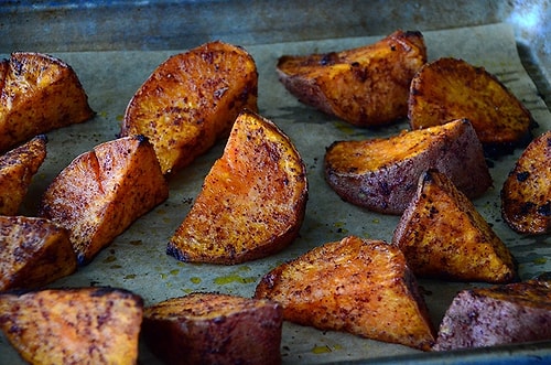 Patatesleri düzgünce yıkayın ve kesimlere bölün. Patates dilimlerini geniş bir kaseye koyun. Küçük bir kapta yağı, tuzu, sumağı, kırmızı biberi ve balı birleşene kadar çırpın. Patateslerin üzerine dökün ve büyük bir kaşıkla patatesler yeterlice kaplanana kadar karıştırın. Yağlı kağıt serili fırın tepsisine patatesleri alın ve 20-30 dakika pişirin.