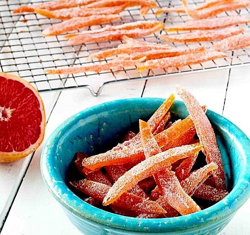 Greyfurt kabuklarını şeritler halinde kesin. Ocağa kaynaması için suyu koyun. Greyfurt kabuklarını bir taşım kaynatıp, suyunuzu değiştirin. Greyfurt ve şekeri tencereye koyup şurup kalmayıncaya kadar kaynatın. Greyfurt kabuklarını 6-8 saat boyunca yağlı kağıt ya da fırın teli üzerinde kurumaya ve soğumaya bırakın. Üzerine dilerseniz biraz daha şeker ve kakule ekleyebilirsiniz. Şekerlemelerinizi hava geçirmez kapta koruma edebilirsiniz.