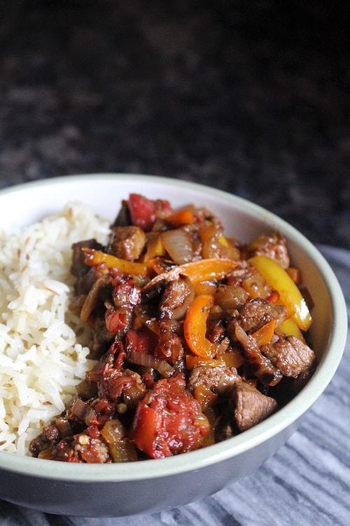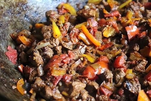 Bir tencereye sıvı yağı ekleyip kızdırın. Kızdırdığınız yağın üzerine yemeklik doğranmış kuru soğanı ekleyin ve pembeleşene kadar pişirin. Üzerine şerit biçiminde doğradığınız kapya biberi ekleyip kavurun. Daha sonra kuşbaşı doğradığınız etinizi ekleyin. Suyunu bırakmaması için eti yüksek ateşte 3-4 dakika pişirin. Etinizin üzerine soyup küp küp doğradığınız domatesi, domates salçasını ve baharatları ekleyin. Kısık ateşte et yumuşayana kadar pişirin.