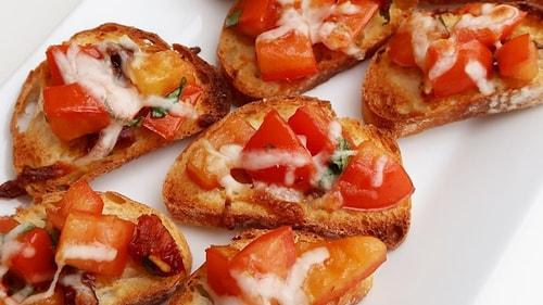 Fırını evvelden 180 derecede ısıtın. Büyük bir kapta, domatesleri, güneşte kurutulmuş domatesleri, sarımsak, zeytinyağı, fesleğen, tuz ve karabiberi birleştirin. Karışımı 10 dakika bekletin. Ekmeği dilimleyin. Bir fırın tepsisine ekmekleri dizin. Üzerlerine hazırladığınız karışımdan paylaştırın. Son olarak üzerine rendelenmiş kaşar peyniri koyun. Peynir eriyene kadar pişirin.
