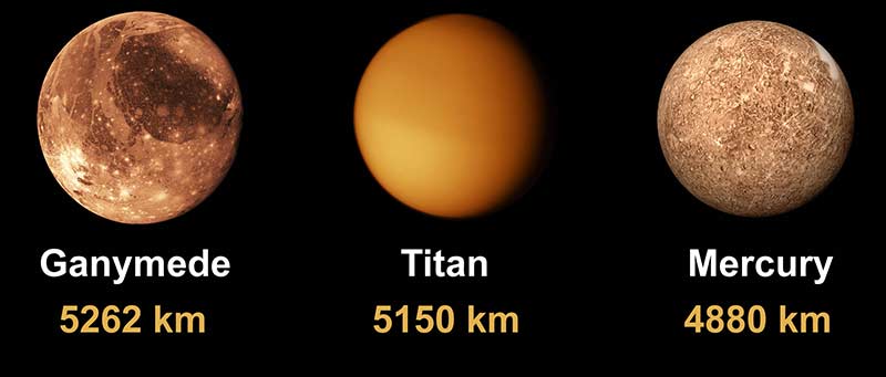 Ganymede, 5 bin 262 kilometrelik çapı ile Güneş’e en yakın gezegen Merkür’den bile daha büyüktür. Bu nedenle Ganymede; Satürn’ün uydusu Titan ile birlikte, gezegen boyutlarında olup da öteki bir gezegenin uydusu olmak zorunda kalan ender gök cisimleri ortasında bulunur.
