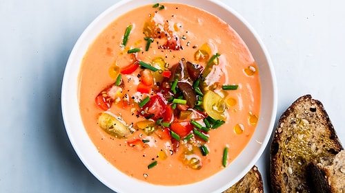 Öncelikle tüm zerzevatları düzgünce yıkayın ve hepsini iri iri doğrayın. Tüm zerzevatları, bayat ekmekten alınmış içi ve sarımsağı mutfak robotu yardımıyla birkaç dakika çekin. Püre haline gelen karışımı tencereye aktarın. İçerisine su, salça, tuz, karabiber, zeytinyağı ve sirkeyi de ek edip tüm bu materyalleri birbiriyle yeterlice özdeşleşecek formda karıştırın. Üst materyallerini doğrayıp çorbanın içine katın. Dilerseniz limonu dilimleyip süsleyebilirsiniz. Servise hazır.