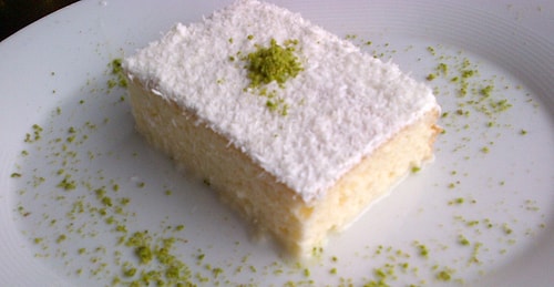 Keki için; yumurtalarla şekeri düzgünce çırpın üzerine kalan materyalleri ek edin ve karıştırın. Kek karışımını yağladığınız borcama dökün ve evvelce ısıtılmış 170 derece fırında yaklaşık 25 dakika pişirin. Muhallebisi için; bir tencereye krem şanti hariç tüm materyalleri ekleyin ve çırpıcı ile karıştırarak koyu bir kıvam alana kadar pişirin. Kek soğuduktan sonra süt ile ıslatın. Soğuyan muhallebiye toz krem şantiyi ekleyip 3-4 dakika çırpın ve kekin üzerine yayın. Son olarak üzerine hindistan cevizi tozu serpin.