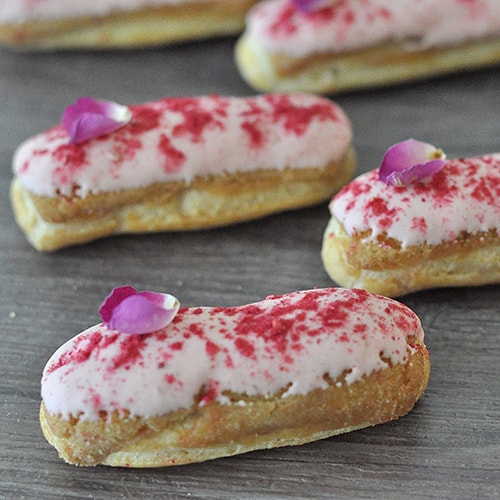 İlk olarak hamurunu hazırlayın. Bir tencereye su, tereyağı, tuz, şeker ve vanilyayı koyun ve kaynatın. Kaynayan karışımın içine elenmiş unu azar azar ekleyin. Bir hamur elde edene kadar karıştırın. Hazırlanan hamuru soğutun. Soğuduktan sonra yumurtaları tek tek kırarak mikser ile karıştırın. Elde ettiğiniz hamuru sıkma torbasına alın. Tepsiye dikdörtgen bir biçim alacak biçimde sıkın. Evvelden ısıtılmış 170 derece fırında 25 dakika pişirin. Ardından kremayı hazırlayın. Krema, süt, puding ve limon suyunu çırpın. Buzdolabında 20 dakika bekletin. Suyu kaynatın. İçine gülleri koyun. Ocaktan alıp 5 dakika demleyin. Gülleri içinden çıkartın. Pudra şekeri, 2 yemek kaşığı gül suyu ve limon suyunu karıştırın. Hamurların içine kremayı sıkın. Üzerine gül sulu karışımı dökün. Gül serpin. 30 dakika buz dolabında bekletip servis edin.