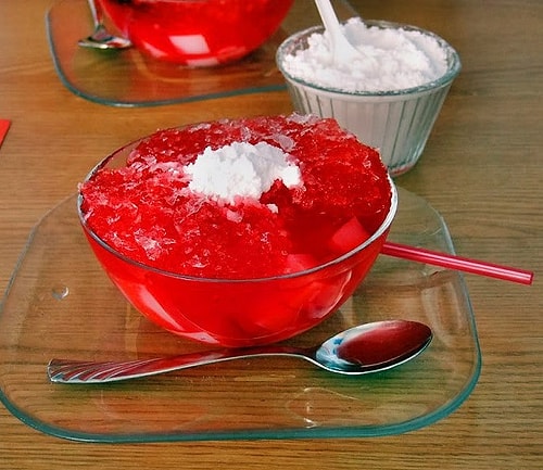 Nişasta ve suyu karıştırarak pişirin. Piştikten sonra düz ve geniş tabanlı bir kaba (fırın tepsisi gibi) alıp soğumaya bırakın. Gül suyu, kırmızı besin boyası ve pudra şekerini güzelce çırpıp buzdolabında soğutun. En az 3-4 saat soğumaya bıraktığınız nişastalı muhallebiyi küp küp kesin ve kaselere alın. Üzerlerine şerbetten dökün ve rendelenmiş buz ekleyin. Pudra şekeri ile servis edin.