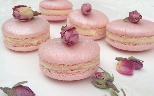 Yumurta akları ve bir fiske tuz, gül ekstresi, şeker ile kar köpüğü haline gelene kadar çırpın. Badem ununu robotta çekin ve pudra şekerini ekleyip tekrar robotta çekin. Bu süreci yaparken kaşıkla müdahale edip; badem ununun uygunca pudra şekerine karıştığından emin olun. Kar köpüğü harcınıza besin boyasını ekleyin. Köpüğü söndürmeden tahta kaşıkla alttan üste hakikat yavaşça karıştırın. En son üzerine robotta çektiğimiz harcı ekleyip yavaşça karıştırın. Tepsinizin üzerine yağlı kağıt koyduktan sonra yemek kaşığı yardımıyla harcımıza yuvarlak formlar vererek dökün. İşlem bittikten sonra tepsinizi bekletmeye alın. Makaronların üstü kuruyuncaya kadar bekleyin. En az 30 dakika beklettikten sonra 15 dakika hiç ağzı açılmayacak halde pişirin. Fırından çıktıktan sonra soğumaya bırakın.