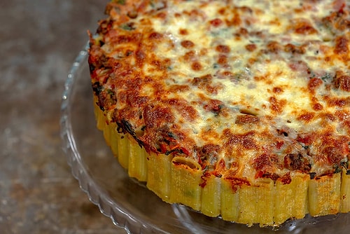 • Kalın kesme makarnaları kaynar suda yaklaşık 8-10 dakika pişirin. Suyunu süzdüğünüz makarnaları toz parmesan peyniri ile harmanlayın. Yağlanmış kelepçeli kek kalıbına, kalın kesme makarnalar dik duracak ve ortalarında hiç boşluk kalmayacak biçimde yerleştirin. Isıtılmış tavada sıvı yağ ile kıymayı kavurun. Sarımsak, domates püresi ve domates rendesini ekledikten sonra domatesler pişene kadar orta ateşte pişirin. Domatesler piştikten sonra tencereyi ocaktan almadan evvel taze fesleğen, tuz ve karabiberini ekleyip ocaktan alın. Kek kalıbına dizdiğiniz makarnaların üzerine kıymalı karışımı dökün ve boşlukları doldurması için spatula yahut kaşık yardımıyla içe yanlışsız yedirin. Kıymalı karışımı uygunca yedirdikten sonra rendelenmiş kaşar peynirini üzerine yayıp, 190 derece fırında 15 dakika pişirin. Pişen makarna pastayı 10 dakika dinlendirdikten sonra kelepçesini çıkarın ve dilimleyerek servis edin.