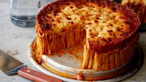 • Kalın kesme makarnaları kaynar suda yaklaşık 8-10 dakika pişirin. Suyunu süzdüğünüz makarnaları toz parmesan peyniri ile harmanlayın. Yağlanmış kelepçeli kek kalıbına, kalın kesme makarnalar dik duracak ve ortalarında hiç boşluk kalmayacak biçimde yerleştirin. Isıtılmış tavada sıvı yağ ile kıymayı kavurun. Sarımsak, domates püresi ve domates rendesini ekledikten sonra domatesler pişene kadar orta ateşte pişirin. Domatesler piştikten sonra tencereyi ocaktan almadan evvel taze fesleğen, tuz ve karabiberini ekleyip ocaktan alın. Kek kalıbına dizdiğiniz makarnaların üzerine kıymalı karışımı dökün ve boşlukları doldurması için spatula yahut kaşık yardımıyla içe yanlışsız yedirin. Kıymalı karışımı düzgünce yedirdikten sonra rendelenmiş kaşar peynirini üzerine yayıp, 190 derece fırında 15 dakika pişirin. Pişen makarna pastayı 10 dakika dinlendirdikten sonra kelepçesini çıkarın ve dilimleyerek servis edin.