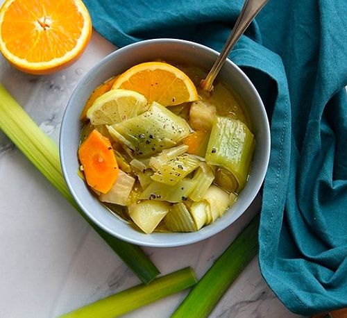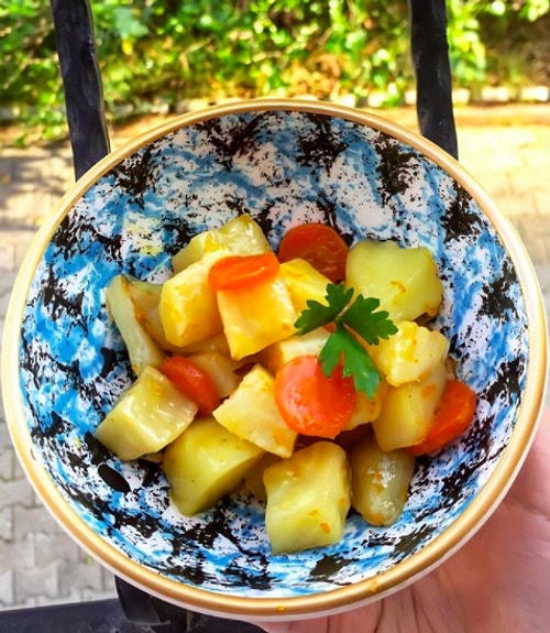 Öncesinde kereviz ve patatesimizi kararmaması için 1 yemek kaşığı un ve yarım limonu sıktığımız su dolu kapta 30 dakika bekletiyoruz. Soğan sarımsak ve havuç az yağda güzelce kavuruyoruz 1 çay bardağı su koyarak haşlıyoruz. Daha sonra kereviz ve patatesi süzüp ek ettikten sonra tuz ve karabiberini ekliyoruz. (5 kısım maydanoz koyuyoruz, pişerken ve piştikten sonra kereviz kokmasın) Portakal suyu, yarım limon suyu ve 3 su bardağı su ek ederek pişirmeye bırakıyoruz. Soğuduktan sonra üzerine dereotu serperek servis yapıyoruz. Afiyet olsun.