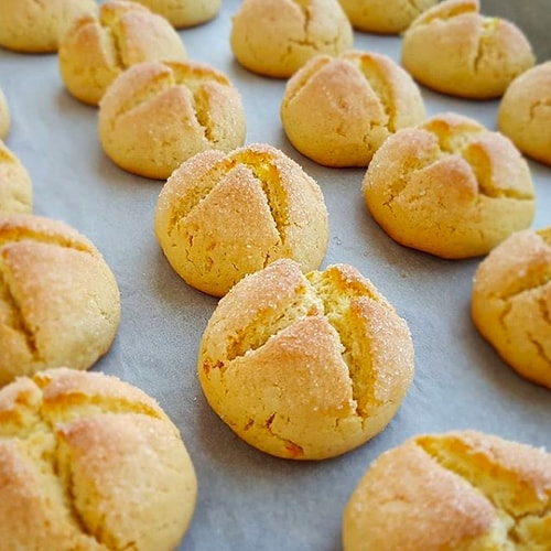 Oda sıcaklığındaki bütün gereçleri karıştırıp ele yapışacak kıvamda bir hamur elde ediyoruz. Yuvarlak formda hamurlar oluşturulup şekere batırılarak yağlı kağıt serilmiş tepsiye diziyoruz. 180 derece fırında kızarana kadar pişiriyoruz. Afiyet olsun.
