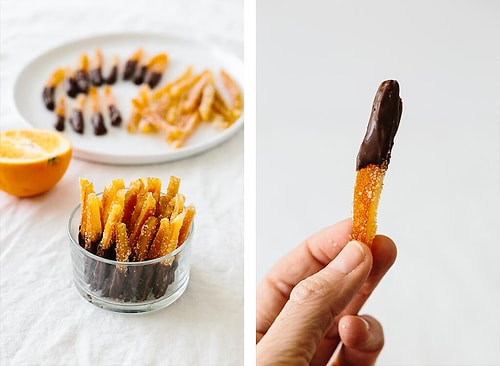 Portakalların kabuklarını uygunca yıkıyoruz. Mutfağınızda kullandığınız zerzevat fırçaları bu iş için ülküdür. Portakalların kabuklarını istediğiniz biçimde doğruyoruz. Beyaz kısımlarının fazlalığını alıyoruz. Tencereye koyup üzerini aşana kadar su dolduruyoruz. Ocağa koyup kaynatıyoruz. 5 dakika kadar kaynatın suyunu döküyoruz. Bu süreci iki defa daha yapıyoruz. Böylece portakalların acısı gitmiş olacak. Üç sefer kaynatıp suyunu süzdüğünüz portakal kabuklarını tekrar tencereye koyuyoruz. Üzerlerine 2 su bardağı toz şekeri ve 2 su bardağı suyu koyup ocağa koyuyoruz. Bu karışımın içinde portakallar saydamlaşana kadar kaynatıyoruz. Ben 20 dakika kadar kaynattım. Portakal kabuklarını tencerenin içinden bir süzgeç yardımıyla alıp yağlı kağıt serilmiş bir tepsiye diziyoruz. Bu tepsinin içinde kurumaya bırakıyoruz. Kurutma sürecinin mühleti, ortamın ısısına ve nemine bağlı olarak değişkenlik gösterebilir. Kuruyup kurumadığını yiyerek denetim edebilirsiniz. Kuruyan portakal kabuklarını dilerseniz eritilmiş çikolataya batırıp çikolatanın donması için tekrar yağlı kağıt üzerine koyup bekletin. Afiyet olsun.