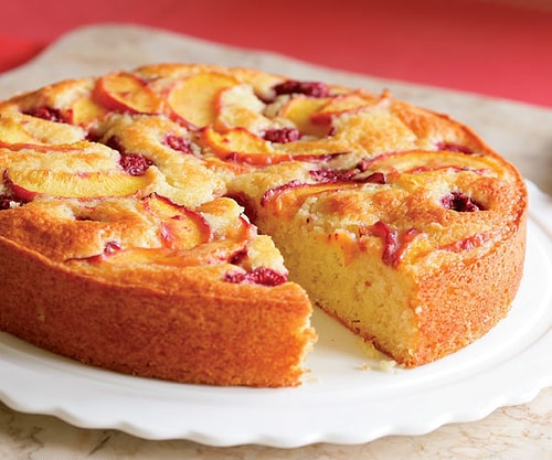 Fırını 180 derece evvelce ısıtın. Oda sıcaklığındaki yağı ve şekeri pamuksu bir kıvam alana kadar düzgünce çırpın. Her seferinde bir tane olmak üzere yumurtaları karışıma ekleyin. Diğer bir kapta un ve kabartma tozunu düzgünce birbirine karıştırın ve çok süratli karıştırmadan sıvı karışıma ekleyin. Yağladığınız kek kalıbının içine yaklaşık biraz şeker serpiştirin ve kestiğiniz şeftali dilimleri ile ahududuları ekleyin. Kek karışımını kalıba alın. 35-40dk altın rengi olana kadar pişirin.