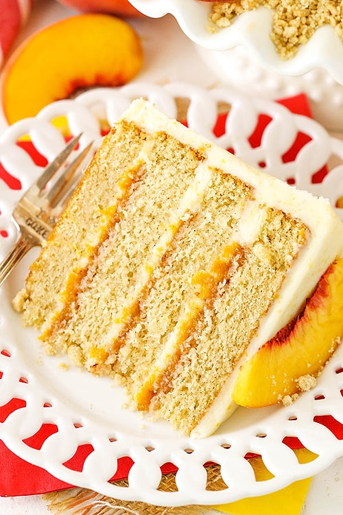Keki için, fırını 160 dereceye ayarlayın. Un, kabartma tozu, vanilya ve tuzu karıştırın. Farklı bir yerde tereyağı ve şekeri çırpın. Yumurtaları teker teker ekleyip karıştırın. En son kremayı ekleyin. Unlu karışımı iki seferde tereyağlı karışıma yedirin. Sütü ekleyip karıştırın. Kek kalıbına hamuru dökün. Bu noktada tıpkı boyutta 3 farklı kek kalıbı kullanmanızı tavsiye ederim. Keki 30-35 dakika pişirin. Kreması için, şeftalilerin yarısını şeker, tarçın, muskat ve bir çimdik tuzla karıştırın. 20 dakika bekletin. Bu sırada kalan şeftalileri doğrayıp buzdolabında bekletin. Şekerli şeftali karışımını blenderdan geçirip püre haline getirin. Püreyi süzün. Krem peyniri çırpın. Şeftali püresini ekleyin. Pudra şekerini ekleyip çırpmaya devam edin. Vanilya ve tuzu koyun. Çırpılmış kremayı da ekleyip çırpmaya devam edin. En son doğradığınız şeftalileri ekleyip karıştırın. Buzdolabında kremayı bekletin. Kek tabanına kremayı sürün. Üzerine öteki keki koyun. Üç kat olacak formda süreci yapın. Kalan kremayla keki kaplayın. Üzerine dilim şeftalileri koyun. Buzdolabında bekletip servis edin.